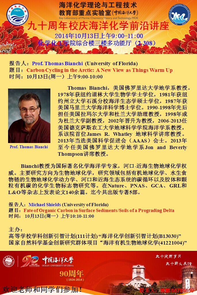 10月13日、14日美国佛罗里达大学Thomas Bianchi教授讲座