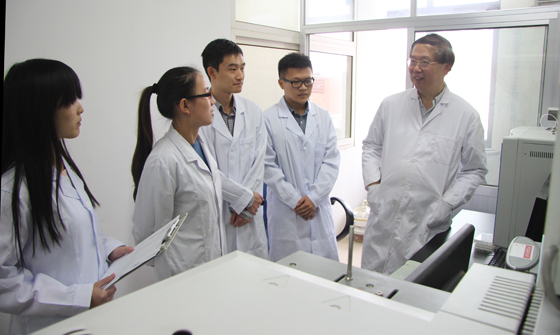 图为该“973”计划项目首席科学家赵美训教授(右一)在实验室与学生交流