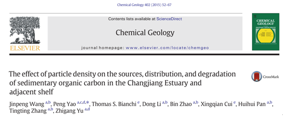 Jinpeng Wang, Peng Yao*, Thomas S. Bianchi, Dong Li, Bin Zhao, Xingqian Cui, Huihui Pan, Tingting Zhang, Zhigang Yu.The effect of particle density on the sources, distribution, and degradation of sedimentary organic carbon in the Changjiang Estuary and adjacent shelf.Chemical Geology, 2015, 402:52-67. (http://dx.doi.org/10.1016/j.chemgeo.2015.02.040)