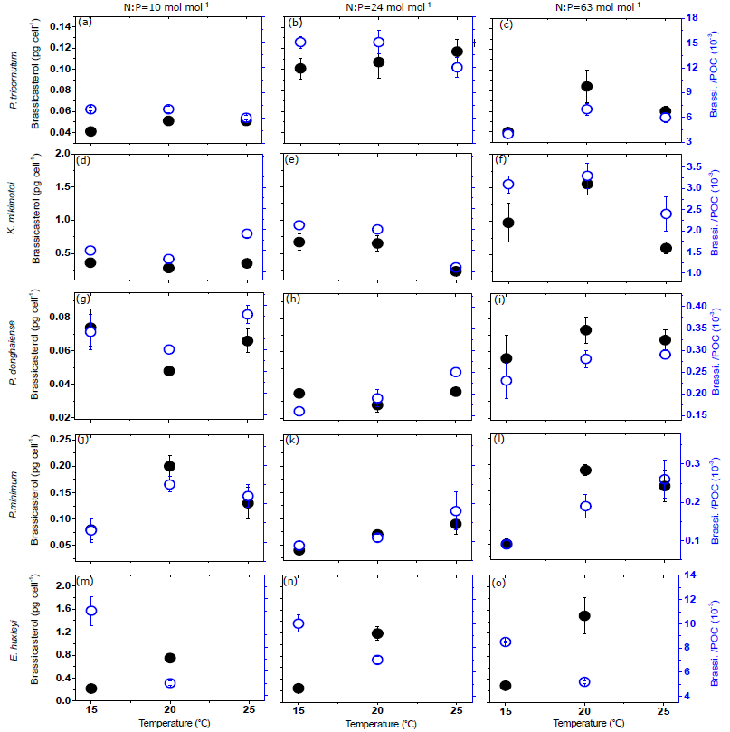 图:温度和营养盐N:P对微藻菜子甾醇的胞内含量以及单位培养体积含量(平均值±SE)的影响。(a-c)三角褐指藻;(d-f)米氏凯伦藻;(g-i)东海原甲藻;(j-l)微小原甲藻;(m-o)赫氏艾密里藻。