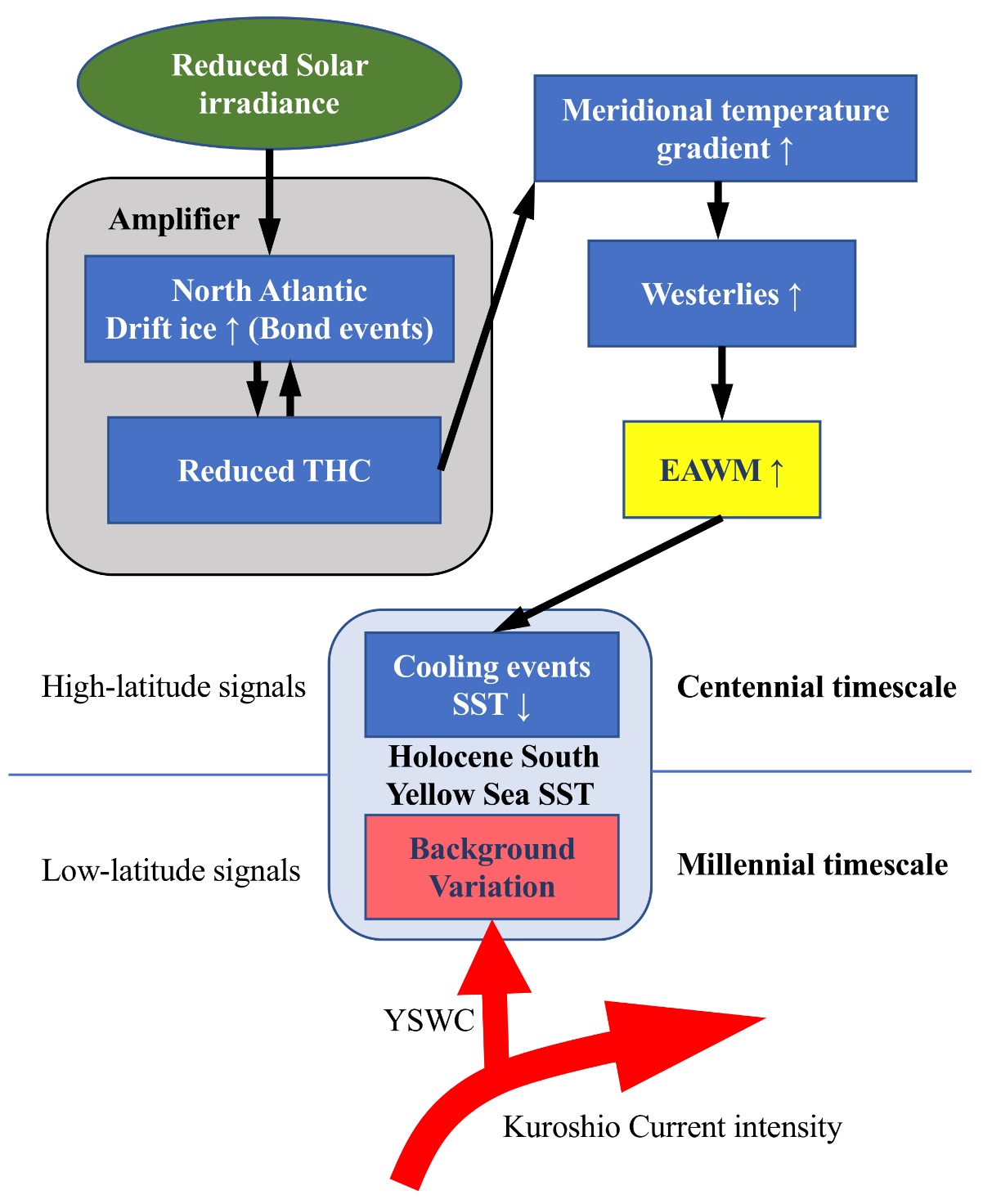 现代黄海表层海水温度同时受到高纬度东亚冬季风以及低纬度黑潮的影响,然而全新世期间黄海的表层海水温度演化机制仍然存在较大争议。贾永颢博士等利用位于南黄海的两个沉积岩芯重建了年代际的表层海水温度记录。结果显示两组表层海水温度记录具有相似的千年时间尺度以及百年时间尺度的变化特征。通过对比黑潮、东亚冬季风、北大西洋浮冰碎屑等记录提出:全新世期间黄海表层海水温度同时受到来自高纬度以及低纬度地区气候强迫的影响,但不同的气候强迫分别在不同时间尺度上起主导作用。黄海表层海水温度在千年时间尺度上主要受到黑潮的影响,而在百年时间尺度上主要受东亚冬季风的影响,响应了北大西洋冷事件(Bondcycle)气候信号。