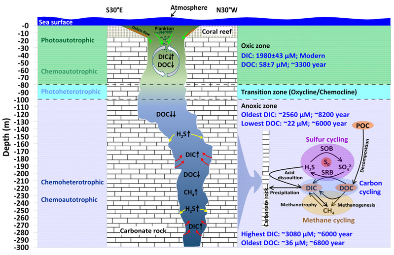 蓝洞是碳酸盐岩台地中完全被海水淹没的大型海洋洞穴。近岸碳酸盐岩体在海平面低位时出露海面受到溶蚀形成溶洞(喀斯特竖井),全新世高海面时,溶洞充水则形成蓝洞。由于与外界仅通过潮汐交换海水,蓝洞内往往具有较大的生物地球化学梯度,跃层明显,微生物群落与普通海洋环境迥异。在过去的几十年里,针对蓝洞环境的物理、化学和生物特征已经开展了较为丰富的研究,但对于蓝洞内碳循环过程了解却很有限。对于蓝洞内碳的来源、分布、年龄(活性)和迁移转化过程以及蓝洞地形和地球化学特征等对碳循环的影响仍然知之甚少。