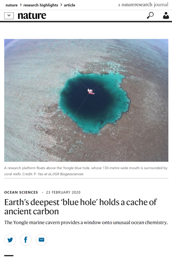 2月27日出版的Nature杂志以研究亮点(Research Highlight)的形式报道了海化重点实验室姚鹏教授领衔的蓝洞研究团队的最新研究成果。该团队近期在国际著名地学期刊《JGR: Biogeosciences》上发表了题为《世界最深蓝洞的碳循环过程(Carbon cycling in the world’s deepest blue hole)》的文章。研究发现,世界最深蓝洞—南海三沙永乐龙洞具有极低含量的溶解有机碳(DOC)和高含量的溶解无机碳(DIC),放射性碳年龄最老超过8000年,迥异于一般海洋环境。《Nature》的报道评论认为“The blue hole offers a rare glimpse of unusual ocean conditions, which may help scientists to understand the extreme chemistry of past and future oceans”。