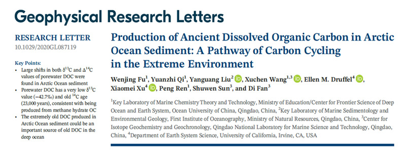 Wenjing Fu, Yuanzhi Qi, Yanguang Liu, Xuchen Wang*, Ellen M.Druffel, Xiaomei Xu, Peng Ren, Shuwen Sun and Di Fan. (2020). Production of ancient dissolved organic carbon in Arctic Ocean sediment: A pathway of carbon cycling in the extreme environment. Geophysical Research Letters.47, e2020GL087119. https://doi.org/ 10.1029/2020GL087119.