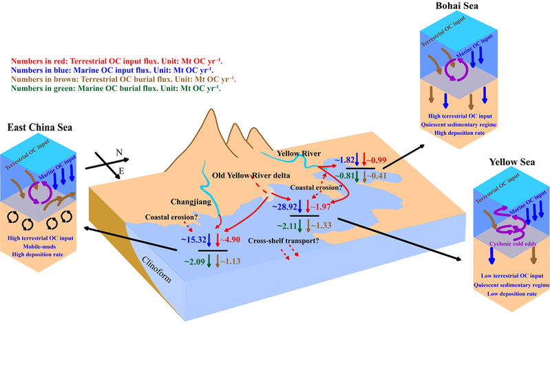 边缘海是重要的海洋和陆地来源有机碳的埋藏中心,有机碳在边缘海的埋藏影响着全球碳的收支平衡。中国东部边缘海是典型的陆架边缘海,其每年可以接收大量来自长江和黄河的颗粒物、有机碳和营养盐等陆源物质,在多种水动力作用的影响下形成了多个泥质沉积区,但是不同泥质区由于有机碳来源和沉积环境的差异,其有机碳的埋藏机制存在很大不同。以往对中国边缘海沉积有机碳埋藏的研究多集中于某个特定区域且研究手段较为单一,缺少从河流到河口,再到边缘海的整体研究,也缺少各区域不同来源有机碳埋藏机制和埋藏通量的比较。有鉴于此,课题组在渤海、黄海和东海采集了155个表层沉积物,测定了沉积物中总有机碳及其稳定同位素组成(δ13C)、粒度组成、比表面积(SSA)、木质素和色素,并整合了前人已发表的有机碳的放射性碳同位素组成(Δ
