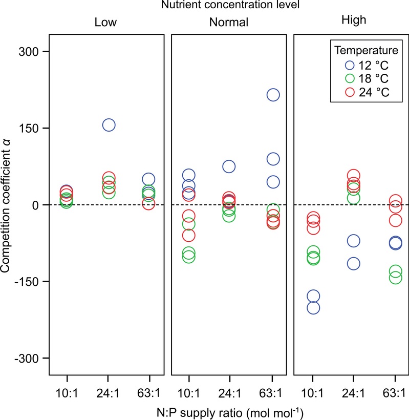 图:硅藻-甲藻竞争系数α对温度和营养盐结构变化的响应:α > 0 甲藻占优势,α < 0 硅藻占优势。