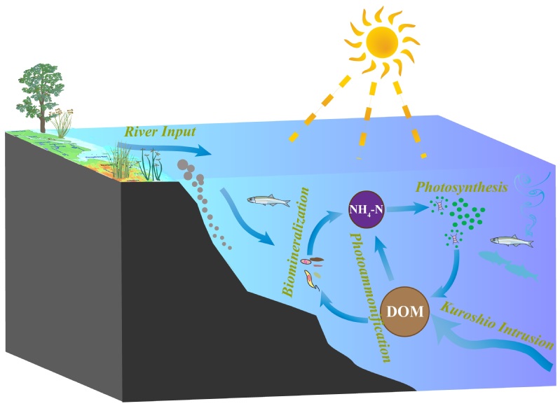 长江口及邻近海域有机质降解与铵盐再生机制示意图