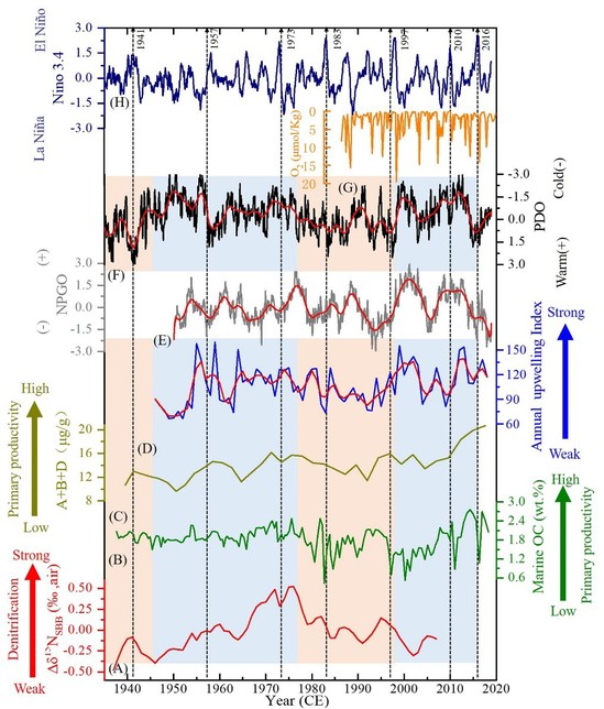 图2: (A) Δδ15NSBB (‰);(B) 海洋OC (wt.%);(C)海洋生物标志物(mg/g);(D)年上升流指数;(g) O2含量(mmol/kg);(E)北太平洋环流振荡(NPGO) ;(F)太平洋年代际振荡(PDO);(H) El Niño-Southern振荡(ENSO);黑线为强烈El Niño事件,如1941年,1957-1958年,1973年,1982-1983年,1997-1998年,2010年和2016年。(D-F)中红线表示经过3年华东移动平均的结果。橙色区域表示PDO的暖期,而蓝色区域表示的冷期PDO。