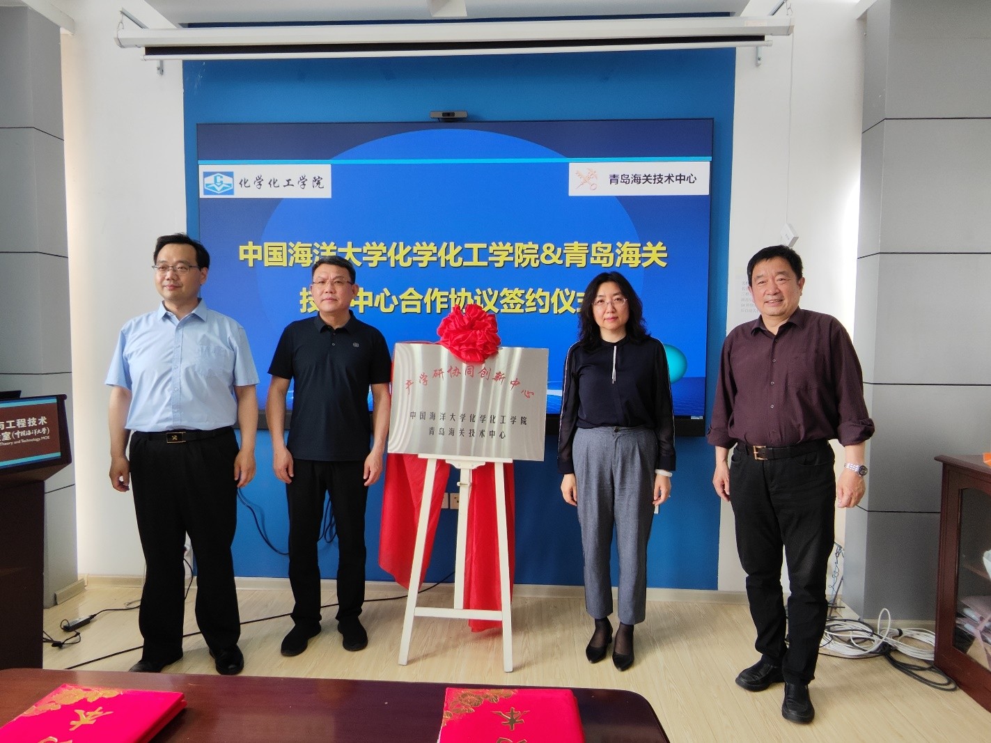 5月30日下午,学校化学化工学院与青岛海关技术中心产学研合作共建签约揭牌仪式在化学化工学院举行。青岛海关技术中心主任李德,青岛海关技术中心党委书记丁矛,青岛海关技术中心副主任苏杰,学校党委常委、校长助理周珊珊,化学化工学院党委书记王玉江,海化重点实验室副主任梁生康出席仪式。