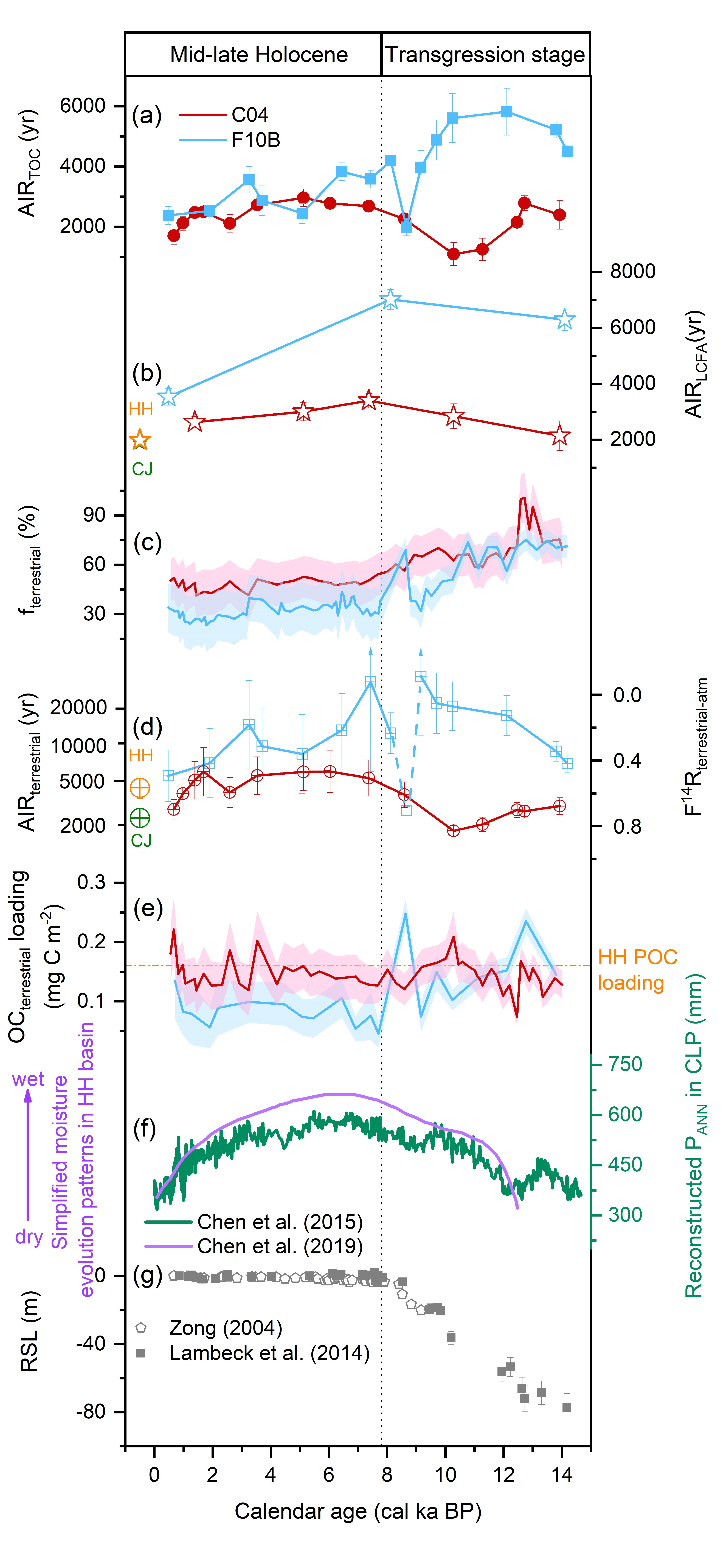 图1. 南黄海C04岩芯(红色)和东海F10B岩芯(蓝色)有机碳年龄等与古环境记录的变化记录。(a)总有机碳的表观初始年龄;(b)长链脂肪酸的表观初始年龄(橙色和绿色星星分别为现代黄河和长江悬浮颗粒物中的长链脂肪酸14C年龄);(c)陆源有机碳在总有机碳中的贡献比例;(d)端元计算的陆源有机碳表观初始年龄(橙色和绿色圈分别为现代黄河和长江悬浮颗粒物中的陆源有机碳14C年龄);(e)陆源有机碳载荷量(橙色虚线为现代黄河POC载荷量);(f)黄土高原年平均降水;(g)西北太平洋海平面变化。