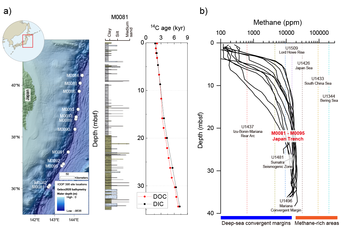 1 a) 深渊沉积物中溶解碳特征(以81号站位为例)b)以及甲烷含量。