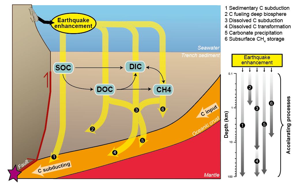 2地震促进了海沟碳转化和深部碳循环。浊流带来的颗粒有机碳被降解为溶解有机碳和无机碳,在深海中积累并支持深部生命活动。碳以多种形式正加速向地球深部俯冲。