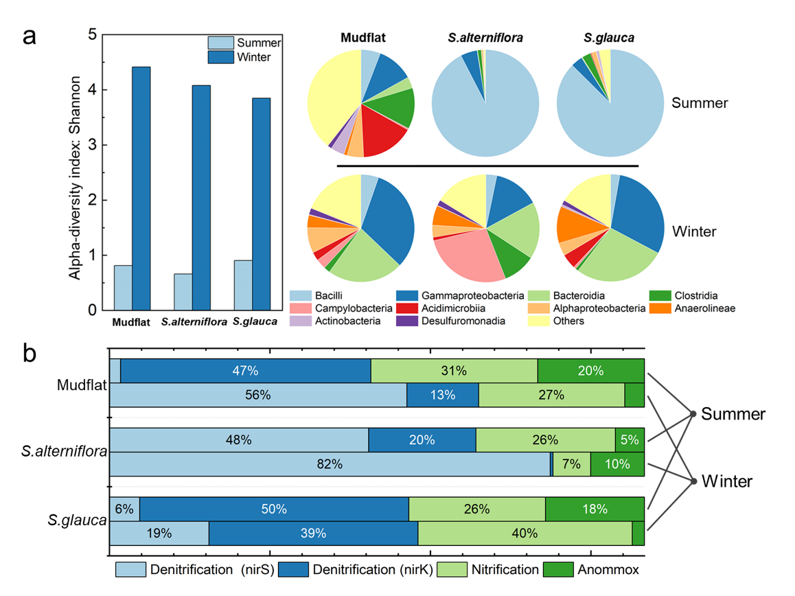 研究表明,植被所覆盖的滨海湿地沉积物NOx的释放速率明显高于无植被沉积物,其释放速率受到季节性温度变化和沉积物中有机碳量的影响,后者主要来自沉积物覆盖植被,并显著促进了滨海湿地沉积物的碳-氮循环。在滨海湿地沉积物中,反硝化细菌具有显著优势并贡献了NO产生量的主要部分(63.8%)。此外,潮汐脉冲是潮间带湿地沉积物NO短时排放的主要驱动因素,而这在以前的研究中鲜有报道。这些结果完善了NOx的生物地球化学循环模式,丰富了全球氮循环的研究内涵,为评估其环境和气候效应提供了科学依据。