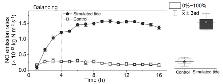滨海湿地沉积物是大气NOx的重要来源,其所释放的NOx主要为一氧化氮(NO),其次为NO的氧化产物:二氧化氮。NO是破坏臭氧层、形成酸雨及光化学烟雾的污染气体,但同时也是某些微生物过程如硝化和反硝化的关键中间物质。本研究对胶州湾滨海湿地进行了全年和昼夜的现场观测,探明了该区域NOx的源-汇模式和影响其释放的主要因素(图2);厘清了产生NO的主要微生物过程以及影响其活性的环境因素(图3);并设计了土壤反应器以进一步探究现场调查中观测到的NO潮汐脉冲的机制(图4)。该研究揭示了我国北方典型滨海湿地NOx释放的时空变化规律、源-汇格局和主控因素,并估算了其NOx年平均释放通量。