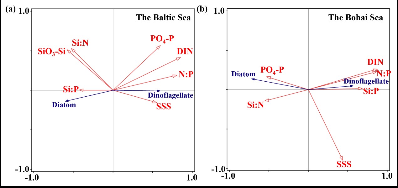 图3. 波罗的海(a)和渤海(b)硅藻和甲藻组成占比与环境因子之间关系的冗余分析(RDA)结果