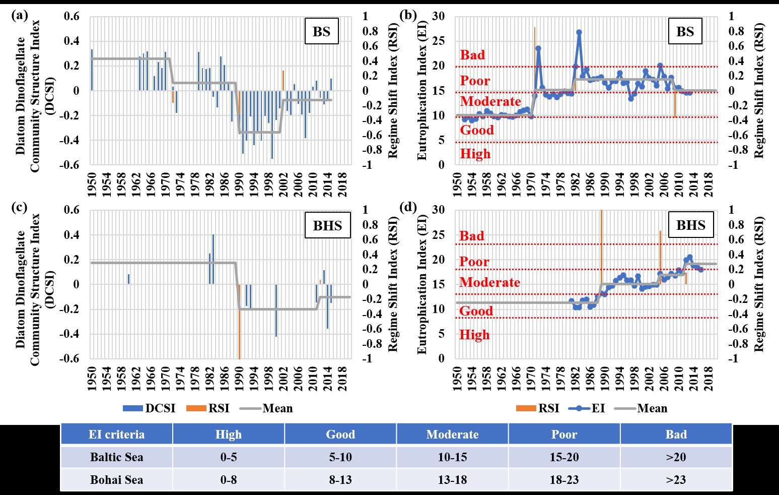 图2. 波罗的海和渤海的硅藻和甲藻组成指数(DCSI)(a 和 c)和富营养化状态(EI)格局转变进程 (b 和 d)