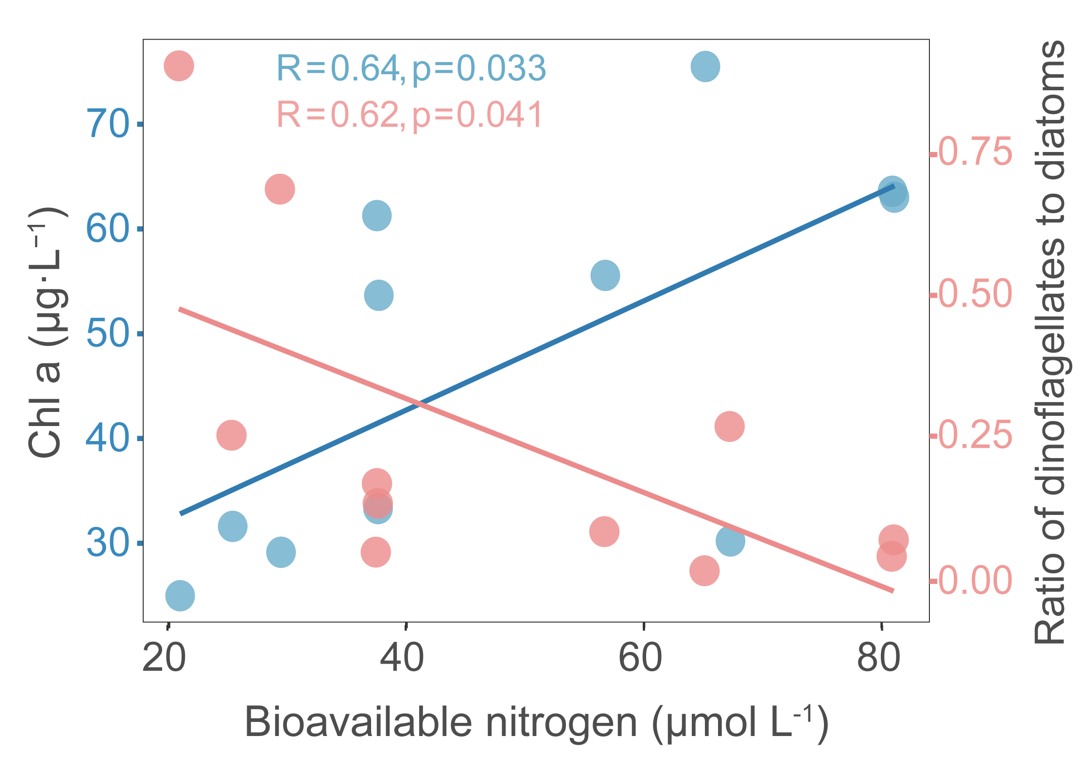 图3:生物活性氮(BAN=DIN+LDON)与叶绿素a(蓝)和甲藻/硅藻比值(红)关系图