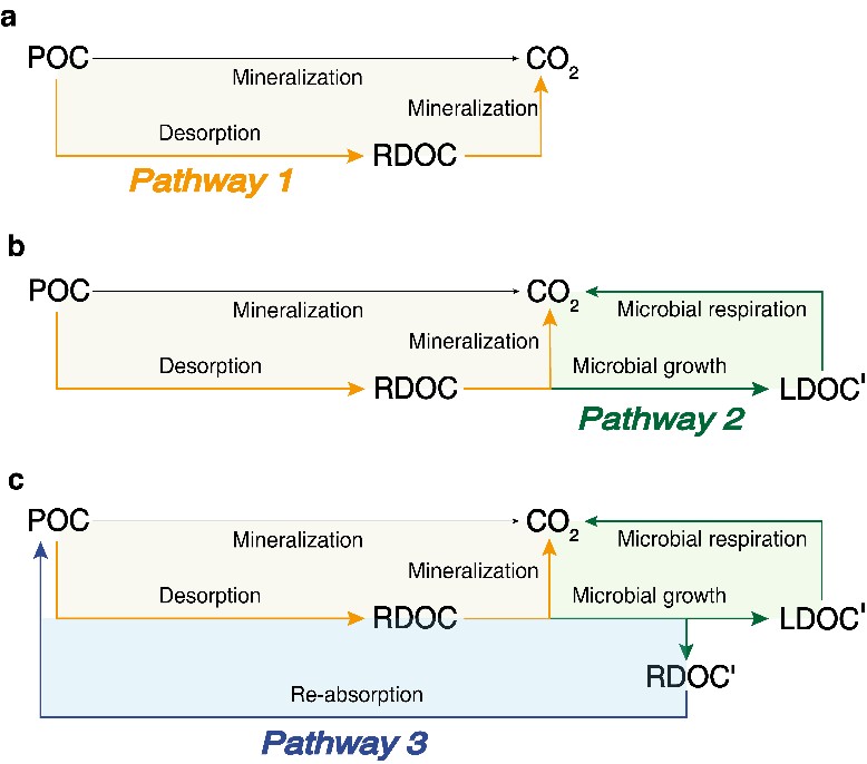 本研究总结了三方面碳循环转化利用过程:重悬浮过程通过增强有机碳的脱附和转化等驱动惰性溶解有机碳(RDOC)向水体中转移(图1,Pathway 1),伴随海水溶解有机碳含量和反应性的增加,转移到水体有机碳可能作为微生物重要的碳源,有助于提高海水中溶解有机碳的生物利用性(图1,Pathway 2),过程中有机碳再吸附可能导致难降解有机质的累积(图1,Pathway 3)。