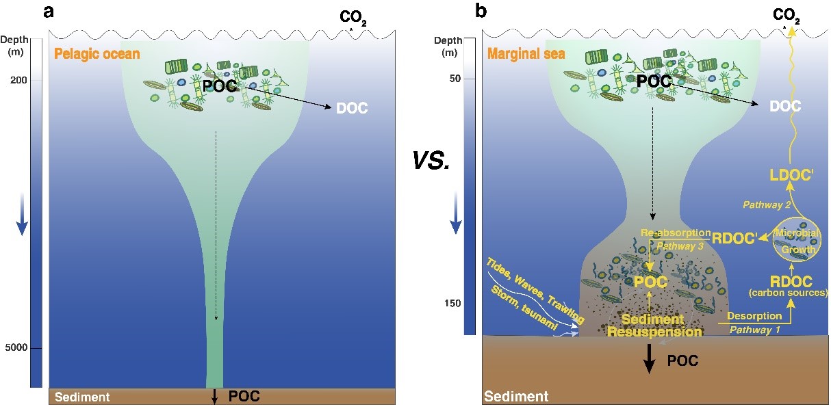 近日,开云电竞网址包锐教授课题组在海洋碳循环理论方面取得了新认识。团队在水环境领域顶刊《Water Research》发表了题为“Sediment resuspension as a driving force for organic carbon transference and rebalance in marginal seas”以及“Influences of hydrodynamics on microbial community assembly and organic carbon composition of resuspended sediments in shallow marginal seas”的2篇系列论文,提出颗粒有机碳向溶解有机碳的转移驱动机制(图1)与碳泵模型(图2)。