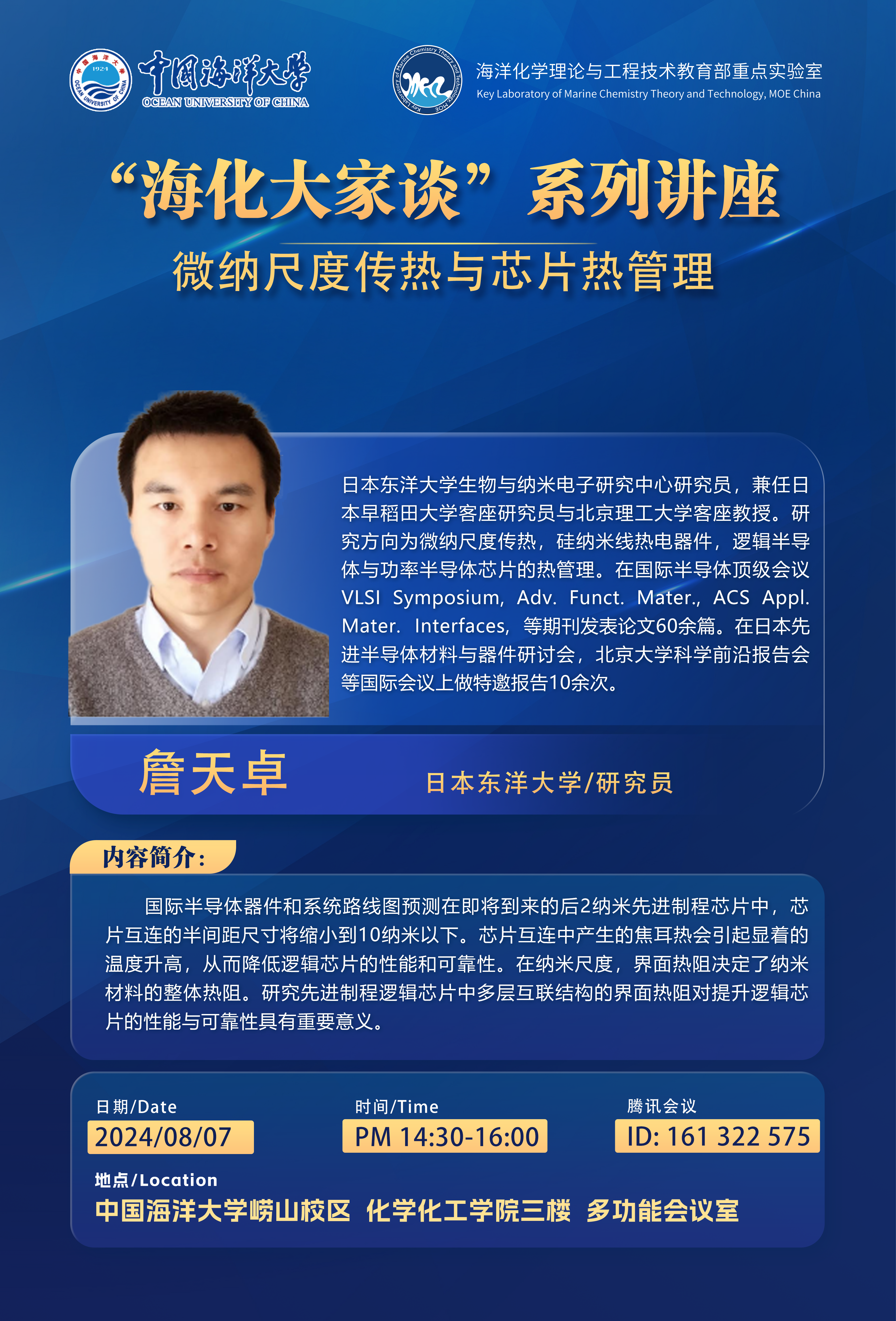 【海化大家谈】8月7日 日本东洋大学詹天卓研究员报告