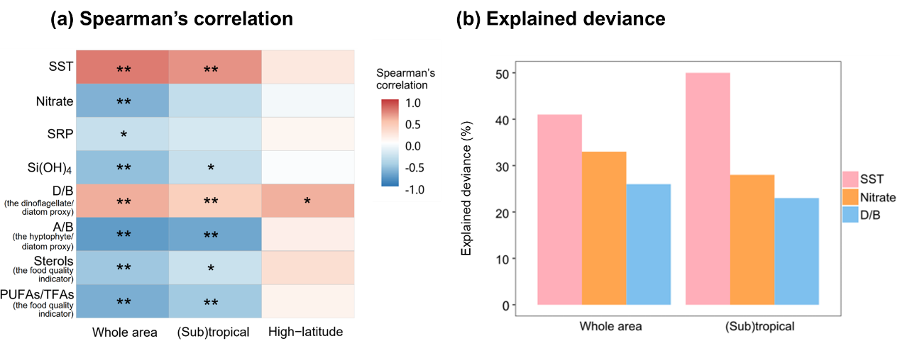 (a)POC:PON与生物因素和非生物因素的斯皮尔曼相关性分析;(b)主要影响因子解释的POC:PON变化的百分比