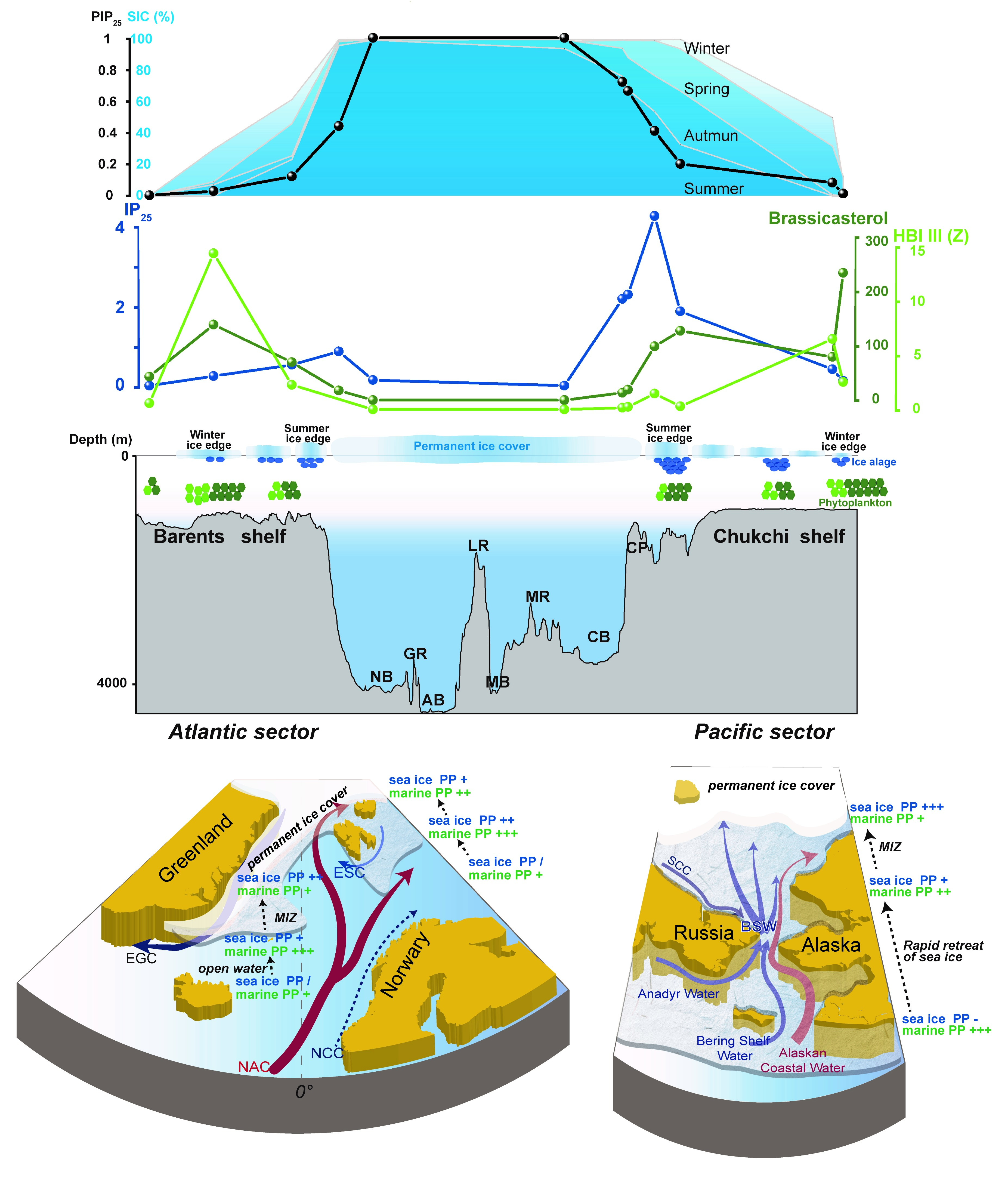 图2 北冰洋从巴伦支海陆架到楚科奇陆架断面的海底地形剖面、海冰状况和初级生产力示意图
