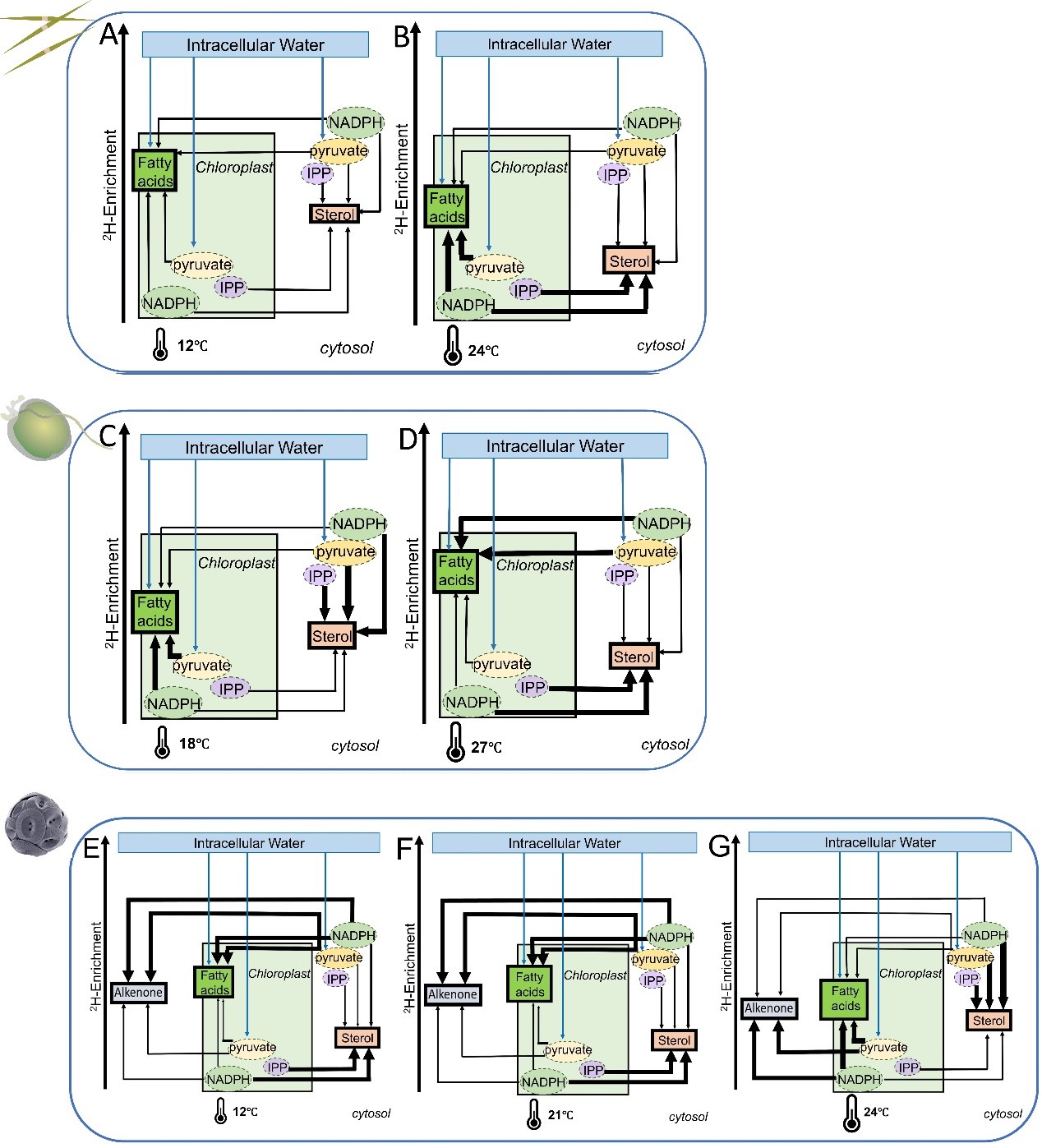 图1. 温度影响三角褐指藻(A和B)、东海原甲藻(C和D)和赫氏艾密里藻(E-G)类脂生物标志物单体分子氢同位素分馏的潜在机制示意图