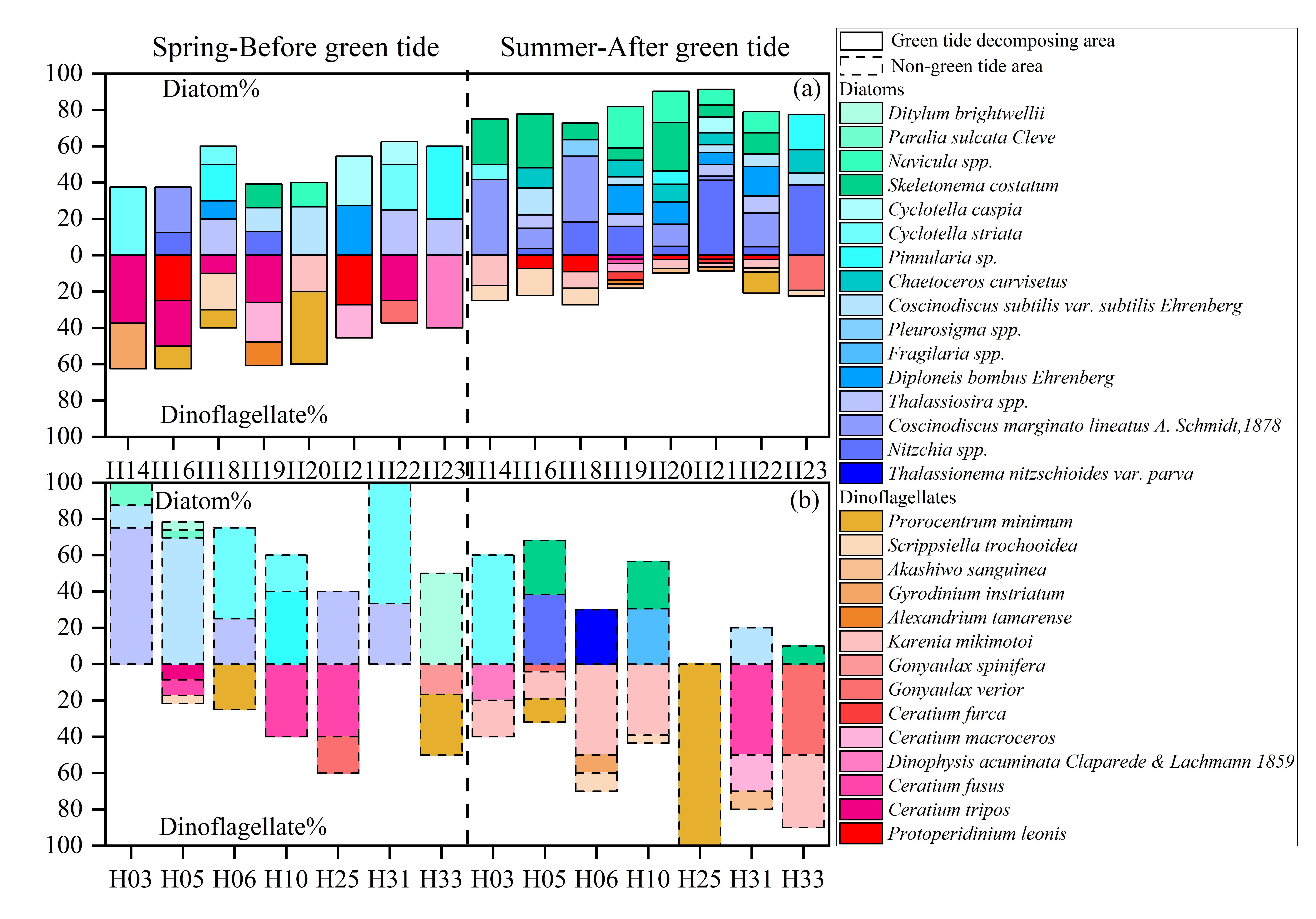图2 浒苔爆发前后南黄海浒苔绿潮消亡区(a)及非浒苔绿潮消亡区(b)的浮游植物群落结构变化