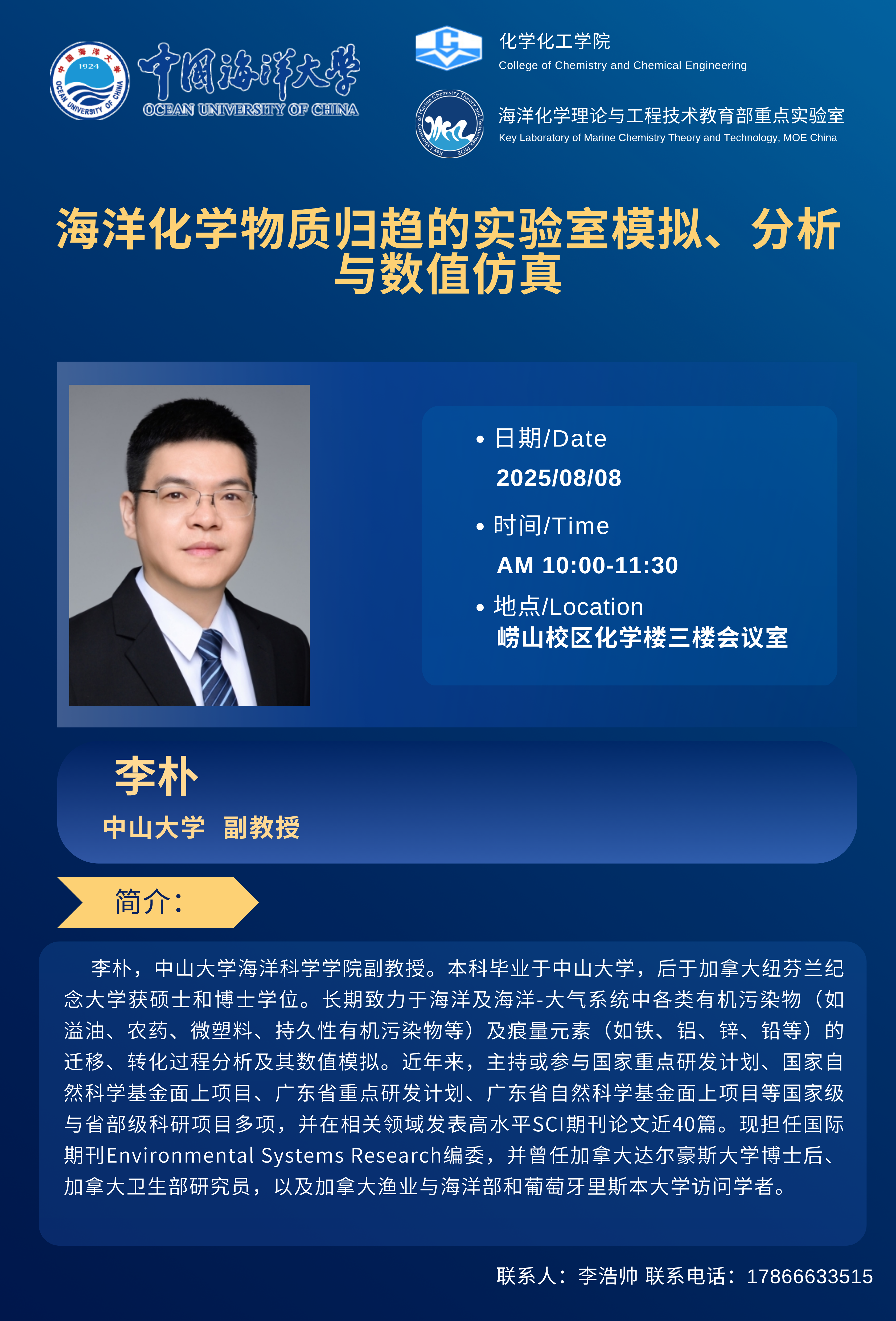 8月8日李朴副教授报告:海洋化学物质归趋的实验室模拟、分析与数值仿真