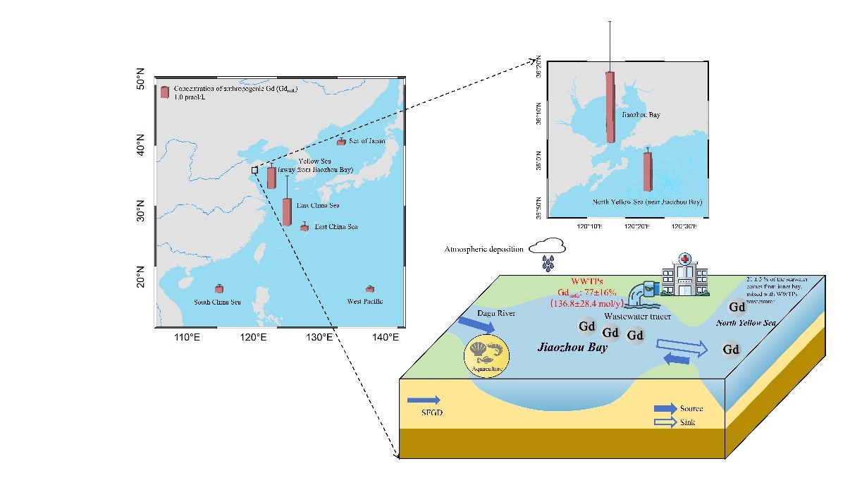 稀土元素(REE)作为一类新兴水环境污染物,近年来因高科技产业的广泛应用而大量进入自然水体。其中,钆(Gd)作为REEs之一,为磁共振成像钆基造影剂(Gd-BCA)的核心成分,经人体代谢后随污水处理厂出水排入环境。由于Gd具有潜在的神经毒性和细胞毒性,其在环境中的迁移行为备受关注。自20世纪90年代首次在德国河流中检测出人为源钆(Gdanth)以来,全球多地水体均报道了Gdanth的广泛存在。然而,我国现有研究多集中在长江和珠江流域,对近海Gdanth的来源及传输的认识仍十分有限。