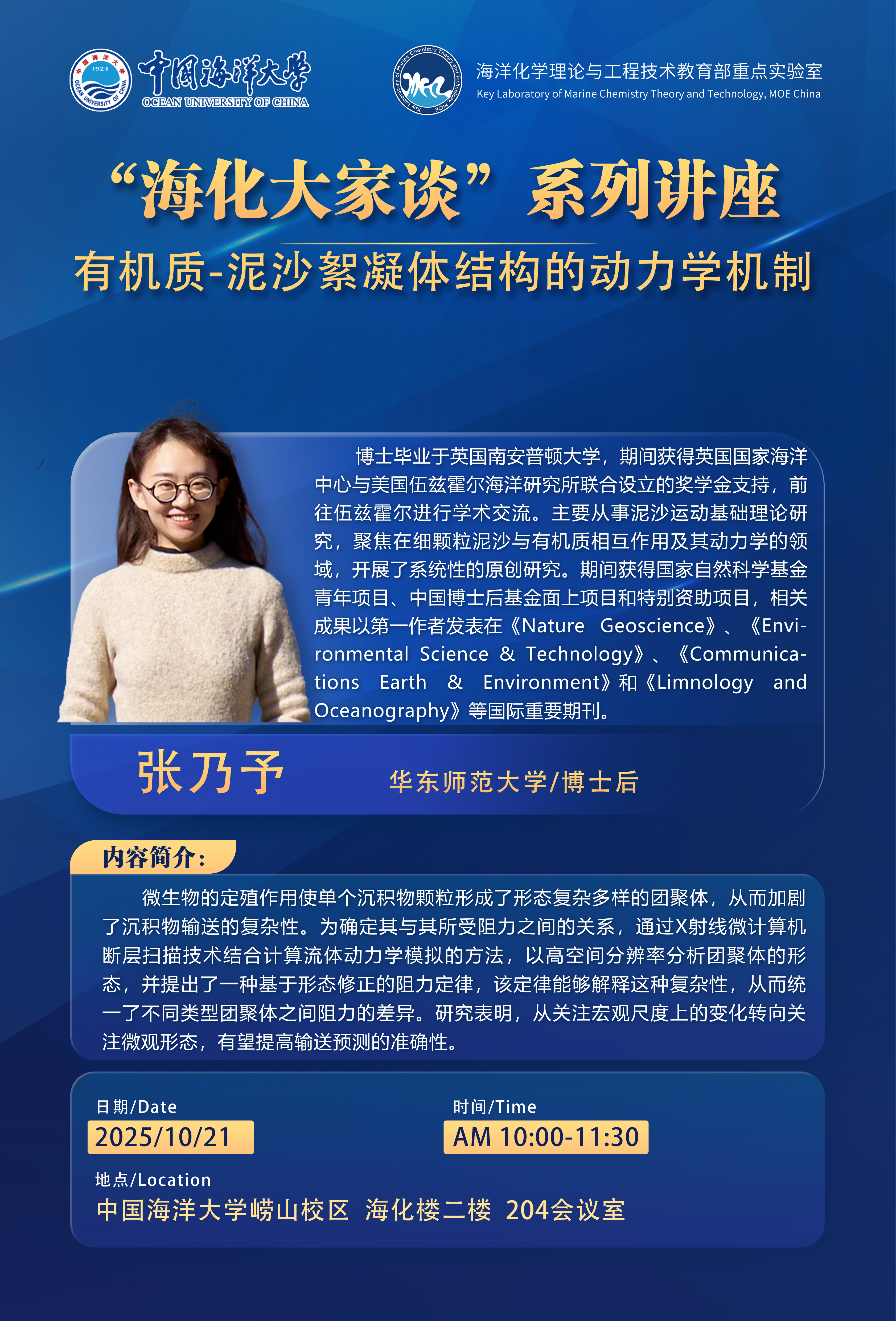 【海化大家谈】10月21日 张乃予博士后报告:有机质-泥沙絮凝体结构的动力学机制
