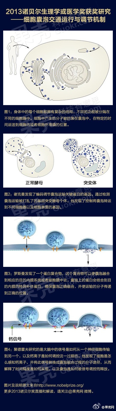 新华网斯德哥尔摩10月7日电(记者和苗 付一鸣)瑞典卡罗琳医学院7日在斯德哥尔摩宣布,将2013年诺贝尔生理学或医学奖授予美国科学家詹姆斯・罗思曼、兰迪・谢克曼以及德国科学家托马斯・祖德霍夫,以表彰他们发现细胞的囊泡运输调控机制。 揭晓今年诺贝尔生理学或医学奖的发布会按惯例在卡罗琳医学院“诺贝尔大厅”举行。当地时间11时30分(北京时间17时30分),诺贝尔奖评选委员会秘书长戈兰・汉松宣布了获奖者名单和获奖原因。 诺贝尔奖评选委员会在声明中说,这三位科学家的研究成果解答了细胞如何组织其内部最重要的运输系统之一――囊泡传输系统的奥秘。谢克曼发现了能控制细胞传输系统不同方面的三类基因,从基因层面上为了解细胞中囊泡运输的严格管理机制提供了新线索;罗思曼20世纪90年代发现了一种蛋白质复合物,可令囊泡基座与其目标细胞膜融合;基于前两位美国科学家的研究,祖德霍夫发现并解释了囊泡如何在指令下精确地释放出内部物质。 细胞生命活动依赖于细胞内的运输系统。所谓囊泡运输调控机制,是指某些分子与物质不能直接穿过细胞膜,而是依赖围绕在细胞膜周围的囊泡进行传递运输。囊泡通过与目标细胞膜融合,在神经细胞指令下可精确控制荷尔蒙、生物酶、神经递质等分子传递的恰当时间与位置。例如,对控制血糖具有重要作用的胰岛素,正是借由囊泡进行精确传递并最终释放在血液中。 若囊泡运输系统发生病变,细胞运输机制随即不能正常运转,可能导致神经系统病变、糖尿病以及免疫紊乱等严重后果。诺贝尔奖评选委员会在声明中说,“没有囊泡运输的精确组织,细胞将陷入混乱状态”。 诺贝尔奖评选委员会说,三位获奖者的研究成果揭示了细胞如何在准确的时间将其内部物质传输至准确的位置,揭示出细胞生理学的一个基本过程。 今年诺贝尔生理学或医学奖奖金共800万瑞典克朗(约合120万美元),获奖的三位科学家将平分奖金。 诺贝尔生理学或医学奖揭晓拉开了今年“诺贝尔周”的序幕。未来一周内,物理学奖、化学奖等奖项将陆续揭晓。