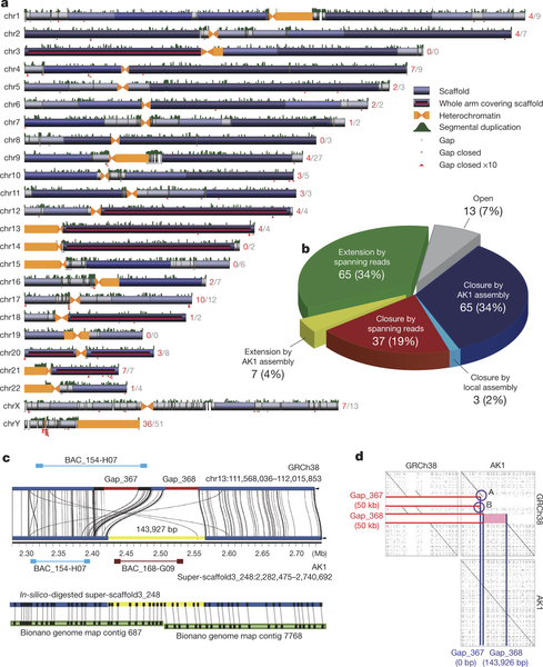 到目前为止该研究在之前最佳的N50长度上提高了18Mb,最大的91个scaffold覆盖了基因组的90%,8个染色体的臂是由单个scaffold构成的。研究人员用AK1的组装序列补齐了在人类参考基因组GRCh38上的190个空缺中的105个,补齐的序列由364kb变成1.5Mb。另外也将剩下的85个空缺中的72个从663kb补充到4.1Mb。该研究鉴定到的18,210个结构变异,包含7,358个删除,10,077个插入,71个转换和704个复杂变异,所有这些变异均在AK1组装结果和人类参考基因组GRCh37之间进行了直接比较,达到了单碱基的分辨率。在18,210个结构变异中,总共有11,927个变异是以前未曾报道的。