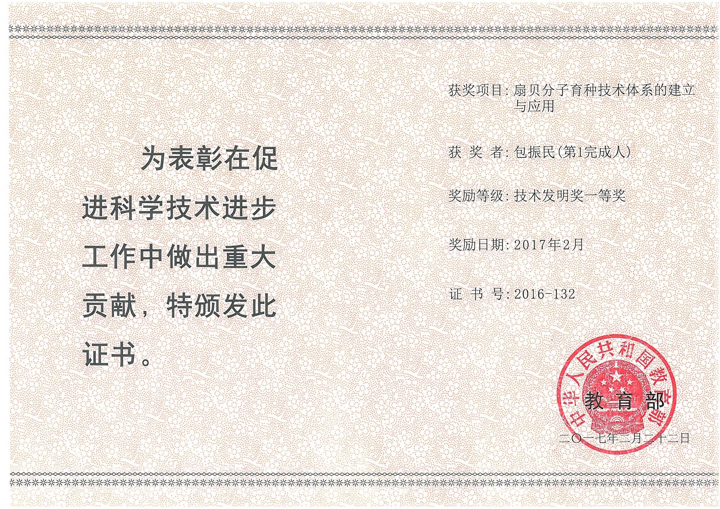 教育部科技发展中心公布了2017年度高等学校科学研究优秀成果奖授奖项目。海洋生物遗传学与育种教育部重点实验室包振民院士牵头取得的成果“扇贝分子育种技术体系的建立与应用”获得教育部技术发明奖一等奖。