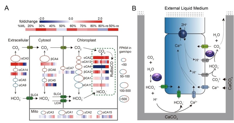 王冬梅等作者采用新一代高通量测序技术构建了高质量的染色体级条斑紫菜基因组,组装成三条染色体,基因组大小为108Mb,其中重复序列占比48%,蛋白质编码基因共12,855个。通过比较基因组学分析鉴定出条斑紫菜基因组中“基因拷贝数显著增多”的基因家族。其中与抗氧化有关的基因家族,如SOD,LOX,TRX、TYR等,均呈现叶状体世代特异性的表达活性,且在失水逆境下这些叶状体特异基因具有显著上调的转录特征,表明抗氧化基因家族的扩张及共表达特征是叶状体世代适应极端环境的重要遗传基础。碳酸酐酶(CA)是藻类二氧化碳浓缩机制中的关键基因,条斑紫菜基因组中CA基因家族显著扩张。作者根据各CA蛋白的亚细胞定位,在不同世代以及叶状体失水逆境下的转录表达特征,构建了紫菜二氧化碳浓缩机制模型,揭示紫菜叶状体在干露失水时利用空气二氧化碳作为碳源的遗传机制。同时,丝状体世代也具有特异性表达的分泌性CA蛋白。作者通过同位素标记、酶活抑制实验、生化酶活测定等,证实栖居于贝壳中的丝状孢子体在细胞外CA作用下,将贝壳中的碳酸钙转化为碳酸氢根,可作为丝状孢子体吸收利用的主要碳源之一。另外,研究还证明来自于细菌的基因水平转移是条斑紫菜基因家族扩张的进化来源之一。