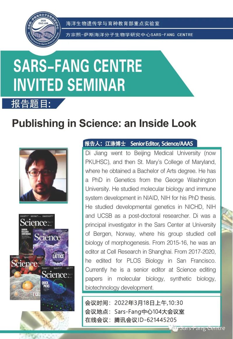 实验室方宗熙-萨斯海洋分子生物学研究中心(Sars-Fang Centre)将邀请《Science》资深编辑江涤教授进行在线学术报告。报告详情: