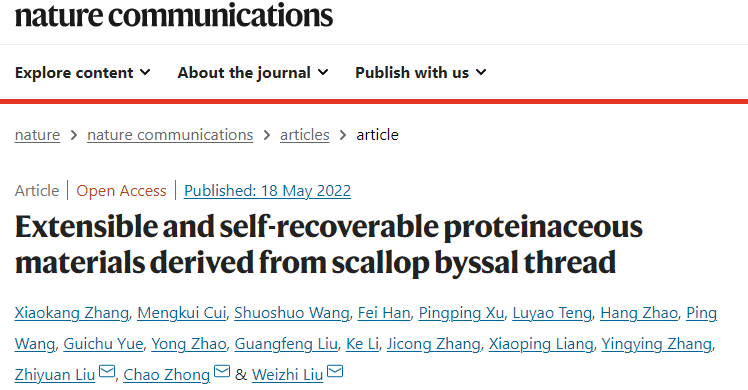 5月18日,开云电竞网址海洋生物遗传学与育种教育部重点实验室刘伟治团队、中国科学院深圳先进技术研究院钟超团队以及刘志远团队在Nature Communications上在线发表题为“Extensible and self-recoverable proteinaceous materials derived from Scallop Byssal Thread”的论文。研究团队经过多年潜心研究,在扇贝足丝蛋白仿生材料研究领域取得重要研究进展。