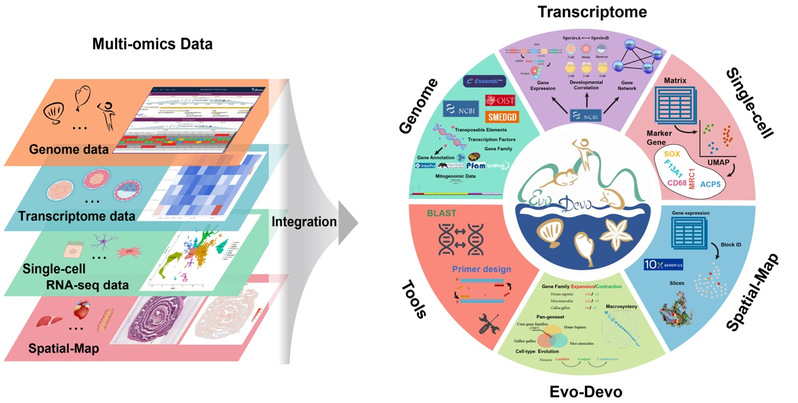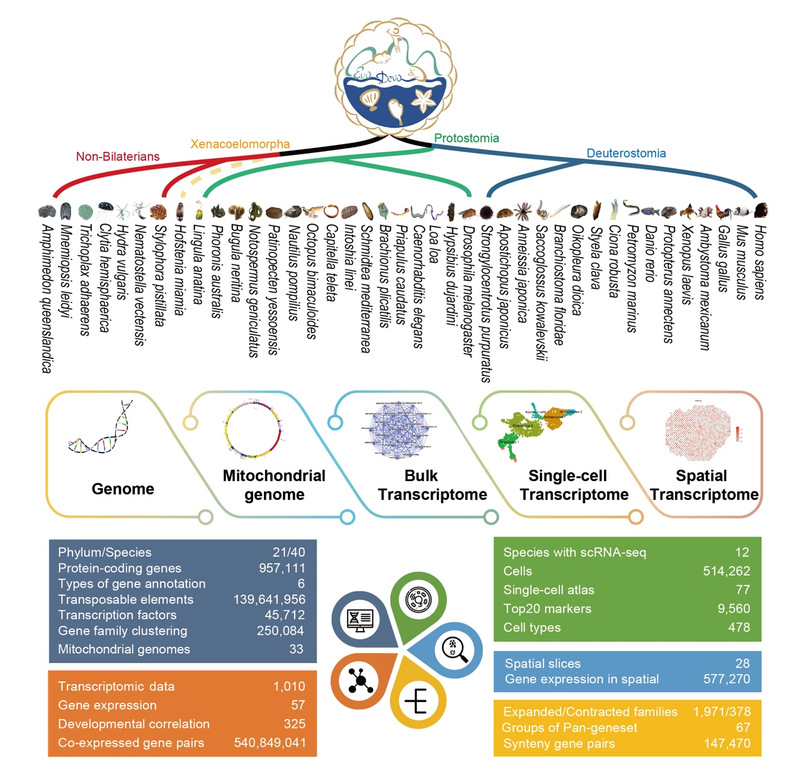 进化发育生物学(EvoDevo)是近年来国际上迅速崛起的新兴前沿交叉学科,旨在通过研究生物界高度多样化的发育过程,从而深刻归纳阐释发育过程背后隐藏的进化驱动机制和规律,以解答被Science杂志评为125个最具挑战性的科学难题之一的生物多样性决定机制问题。在过去的几十年里,利用经典模式生物(如黑腹果蝇、秀丽隐杆线虫、斑马鱼和小鼠)所开展的广泛研究给我们带来了生物学领域诸多重大发现和突破,奠定了目前遗传、发育和进化等领域的基本知识构架体系。然而,为数甚少的模式动物无法涵盖动物界高度多样化发育过程的全部信息,更无法提供对整个动物界发育进化过程的全景式解读和归纳。为填补这一极大的知识空白,利用具有关键系统发育位置和全谱系覆盖的新兴模式生物来描述整个生命树的发育进化,对驱动进化发育学领域的跨越式发展具有极为重要科学价值和意义。高通量测序技术的革命性突破及各类组学技术广泛应用,为生命科学领域带来前所未有的发展契机。基因组学、转录组学以及单细胞技术加速了许多传统的非模式生物转变成新兴的模式生物(如栉水母、丝盘虫、玻璃海鞘、侏儒蛤等)。尽管近些年非经典模式动物类群已积累了海量的多组学资源,并仍以史无前例的规模快速增长,但对这些储存分散的组学资源进行整合和综合分析仍是目前国际上动物进化和发育研究领域共同面临的重大挑战,迫切需要系统建立面向整个动物界的进化发育综合组学数据库和相应的分析工具和平台。