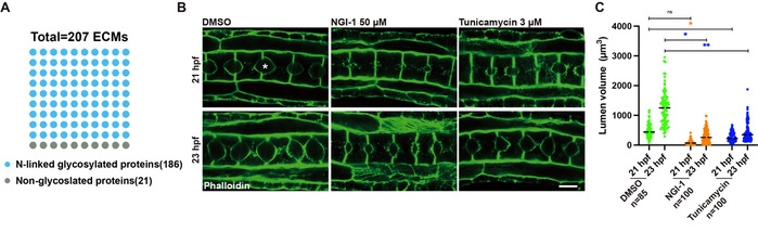 (A) N-连接糖基化蛋白在ECM中的占比。(B) 糖基化抑制剂NGI-1和Tunicamycin显著延缓脊索管腔膨胀Bars = 10 μm。(C) 抑制剂处理后的脊索管腔体积定量图表。