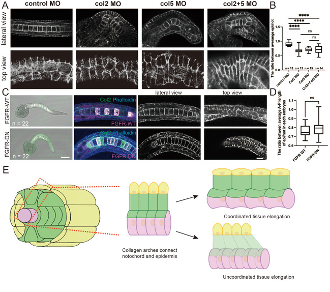 图3. 胶原蛋白超细胞桥参与表皮-脊索协调延伸(A)胶原蛋白基因敲降表皮与脊索形态。(B)A中表皮与脊索细胞长度比值定量统计。(C)FGFR缺失体过表达抑制脊索延伸后表皮与脊索形态。(D)C中表皮与脊索细胞长度比值定量统计。(E)胶原蛋白超细胞桥参与表皮-脊索协调延伸模式图。