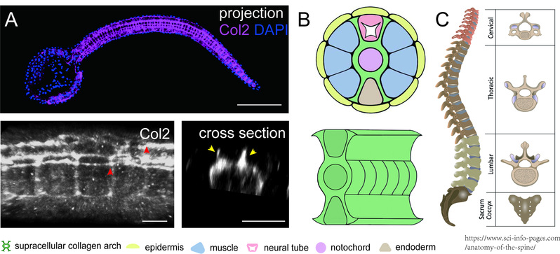 图1. 胶原蛋白超细胞桥形态 (A)胶原蛋白免疫荧光显示超细胞桥的形态。上图Bar = 100 mm,下图Bars = 10 mm. (B)胶原蛋白超细胞桥结构模型图。(C)人类脊索解刨结构示意图(引用自网络)