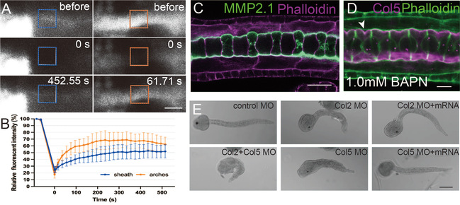 图2. 胶原蛋白超细胞桥具有流动性,参与脊索延伸调控。(A)胶原蛋白超细胞桥和脊索鞘淬灭后恢复实验。Bar = 5 mm.(B)A中淬灭区域相对荧光强度的定量统计。(C)基质金属蛋白酶过表达降解胶原蛋白超细胞桥表型。Bar = 20 mm.(D)BAPN抑制剂处理破坏胶原蛋白纤维交联表型。Bar = 10 mm.(E)胶原蛋白基因敲降表型及过表达营救。Bar = 100 mm.