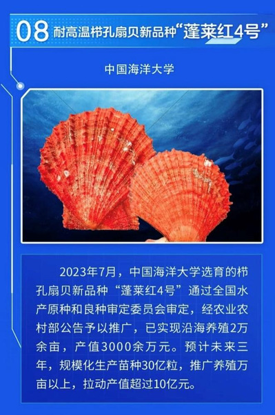 1月11日,由两院院士评选“2023年度中国/世界十大科技进展新闻”暨“2023年度山东省十大科技创新成果”发布活动在烟台举办,我校海洋生物遗传学与育种教育部重点实验室包振民院士团队黄晓婷教授领衔培育的耐高温栉孔扇贝新品种“蓬莱红4号”入选山东省科技创新成果提名榜单。