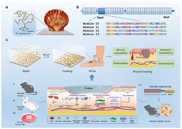 图1. 扇贝足丝蛋白涂层在难愈合创面修复中的应用。a,b) 基于扇贝足丝关键粘附蛋白Sbp9的发现;c) 涂层组装机制及创面促愈合活性探究。