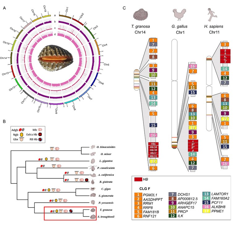 血液是维系动物所有生命活动和生理功能的关键要素。几乎所有的脊椎动物都依靠血液中的血红蛋白(Hb)运载氧气,因此血液通常呈红色。然而在无脊椎动物中,呼吸蛋白多种多样,仅有少数类群的血液为红色,且通常被认为是进化新颖性的体现。那么,无脊椎动物血红性状是如何获得的?其起源和演化是否完全独立于脊椎动物?目前这些关键科学问题的答案仍不清晰,尚有待深入研究。蚶科贝类(俗称血蚶)是为数不多具有红色血液的软体动物类群,是研究无脊椎动物血红性状起源和演化的良好动物模型。
