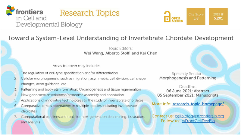 王玮教授应Frontiers in Cell and Developmental Biology 期刊 (IF=5.201)邀请,担任客座编辑,与Georgia Institute of Technology, Alberto Stolfi教授和昆明理工大学陈凯教授共同组织编写Research Topic”Toward a System-Level Understanding of Invertebrate Chordate Development“。