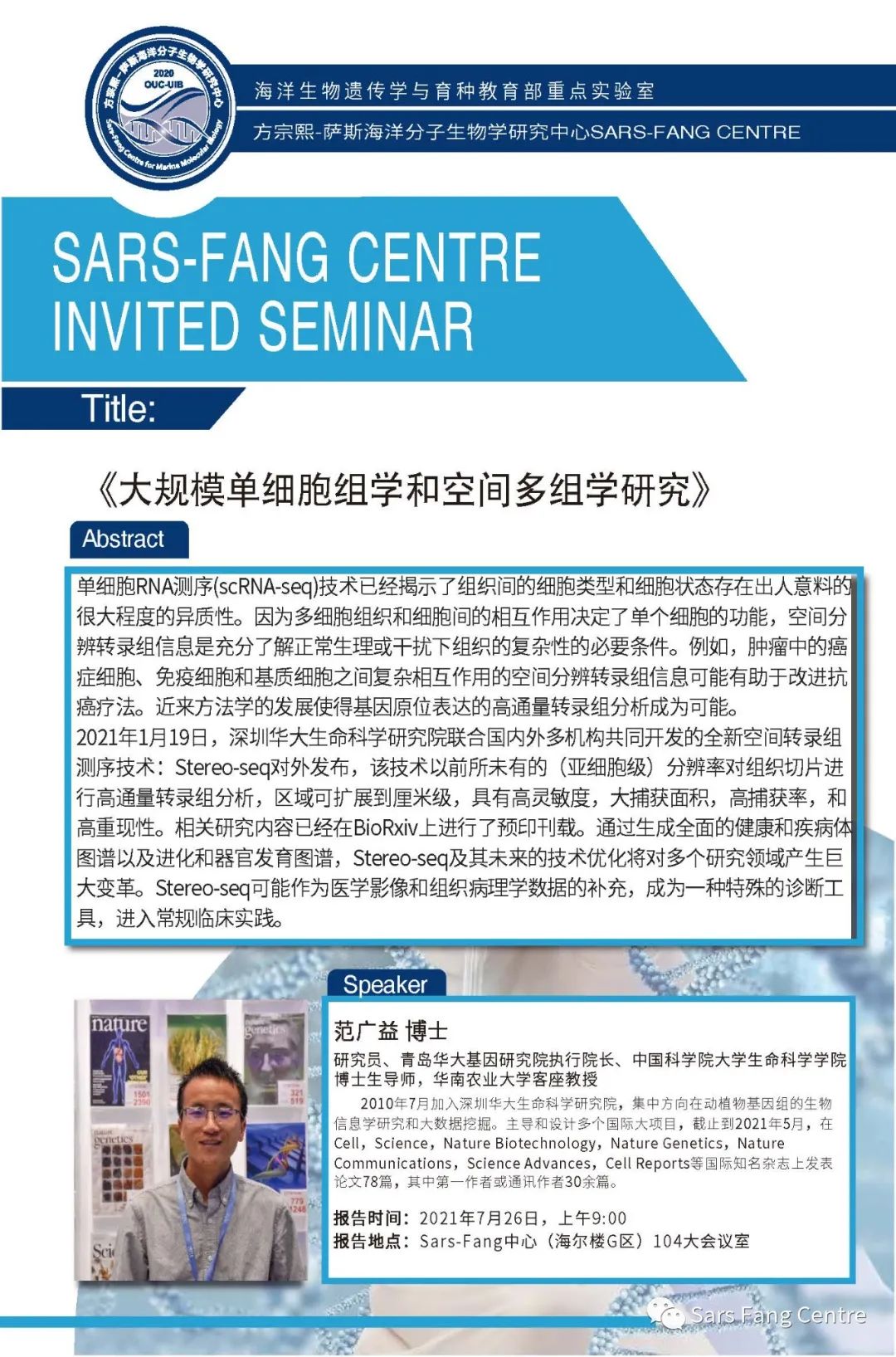 方宗熙-萨斯海洋分子生物学研究中心(Sars-Fang Centre)将邀请青岛华大基因研究院执行院长范广益博士进行报告,并进行实地参观、座谈交流等。报告详情:
