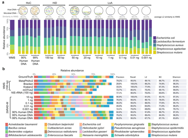 在海大团队前期建立的2b-RAD技术原理基础上(NatureMethods 2012;NatureProtocols 2016),合作团队成功研发出一种新型、高效的“简化”宏基因组分析技术2bRAD-M,该技术通过对约1%的宏基因组测序即可实现高精度解析全部微生物种类和丰度信息。研究团队构建了涵盖17万种微生物(包含真菌、细菌、古菌)的2bRAD特征标签数据库,提供了标准化的2bRAD-M宏基因组分析流程。通过对多种人工混合和自然来源菌群样本的评估结果显示,2bRAD-M在极大降低成本的同时,可实现与鸟枪法宏基因组测序分辨率相当的物种水平分类和丰度鉴定。尤为重要的是,2bRAD-M技术还可实现对现有微生物组技术难以完成的极度困难样品的分析,包括对低至1pg的痕量样品、高度降解DNA(仅50bp),以及99%宿主DNA污染的微生物样品都具有较高的检测灵敏度和结果重现性。2bRAD-M技术为微生物宏基因组研究提供了一种高效、便捷、低成本的检测手段,在动植物的微生物组成分析、复杂环境微生物群落研究以及临床医学样本检测等领域具有广阔的应用前景。