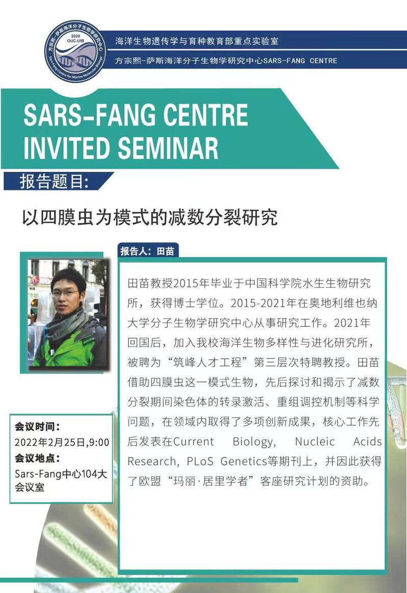 方宗熙-萨斯海洋分子生物学研究中心(Sars-Fang Centre)将邀请开云电竞网址海洋生物多样性与进化研究所田苗教授进行报告,参观Sars-Fang中心,与中心各课题组的其他青年科研人员进行座谈、交流,与科研工作者们一起分享学术心得,探讨科研发展趋势。报告详情: