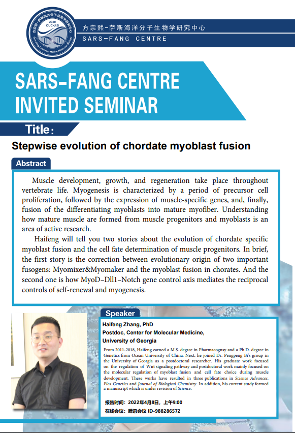 佐治亚大学分子医学中心张海峰博士后进行题为《Stepwise evolution of chordate myoblast fusion》的报告。报告详情: